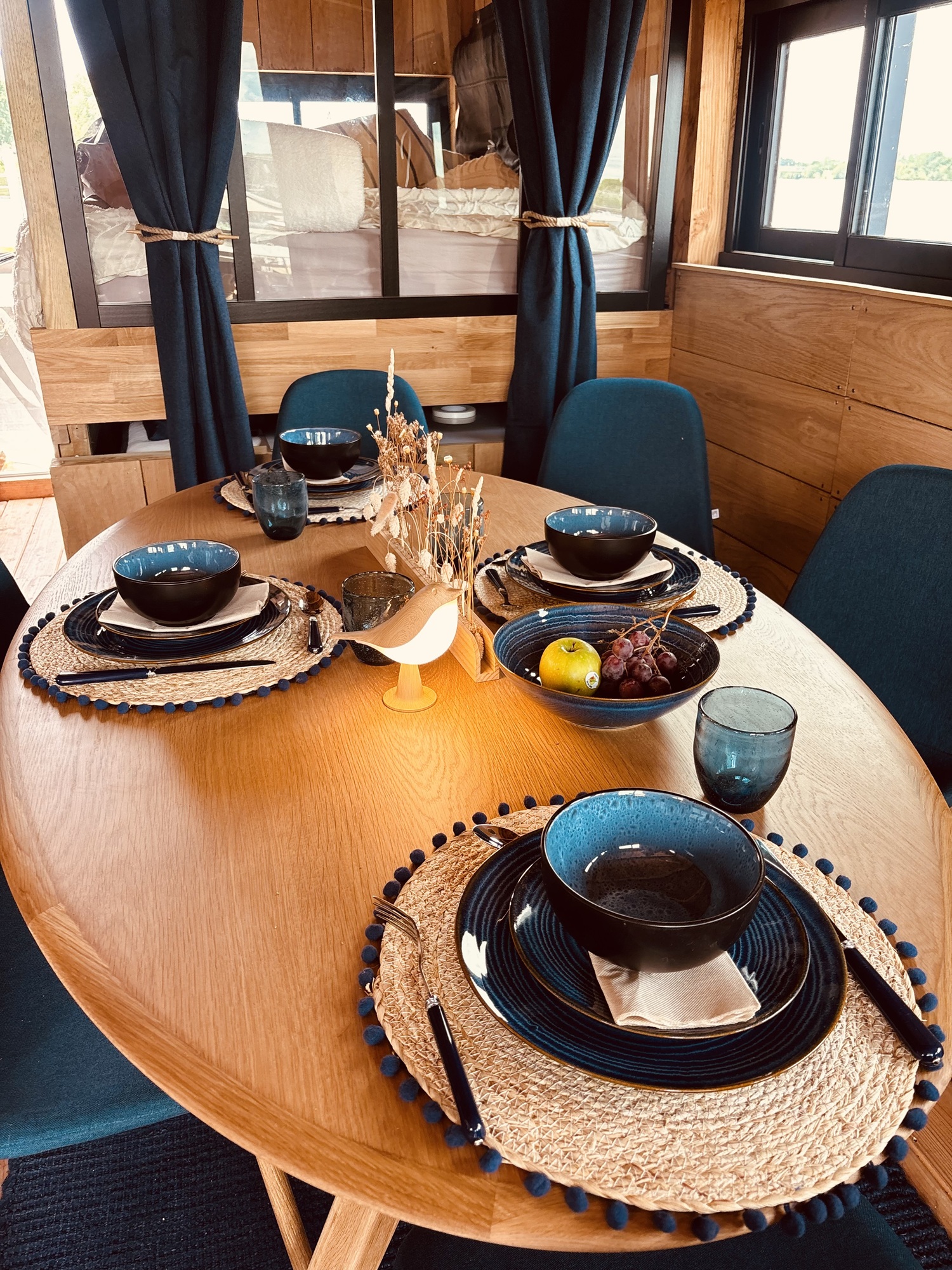 Placé dans un endroit bien choisi, la Rebelle est amarrée sur le bord d’une berge avec une vue imprenable sur les villages de Candes et Montsoreau et leurs magnifiques couchers de soleil.
